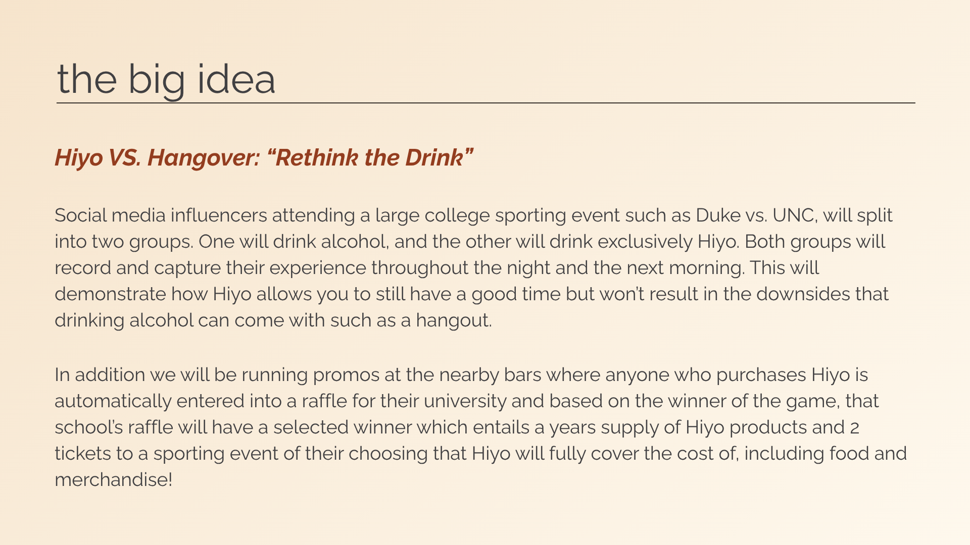 Text-based presentation slide titled 'the big idea' with the subtitle 'Hiyo VS. Hangover: 'Rethink the Drink'' and a paragraph explaining a social media event involving Duke vs. UNC sports game, Hiyo consumption, and promotional raffle.