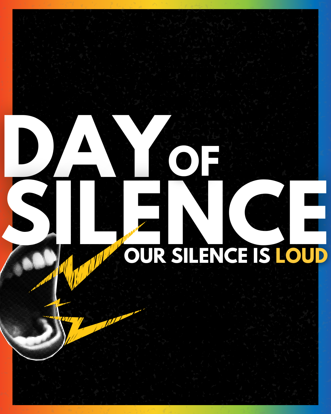 Bold text on a black background reads 'Day of Silence. Our silence is loud,' with a graphic of a shouting mouth and yellow lightning bolts.